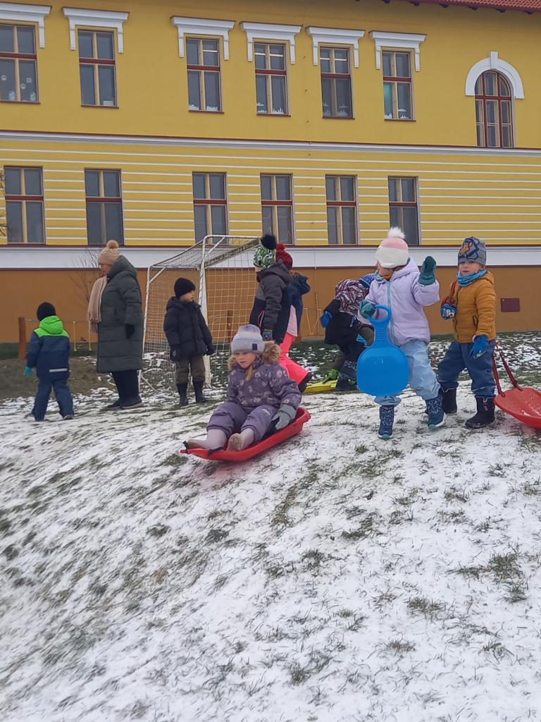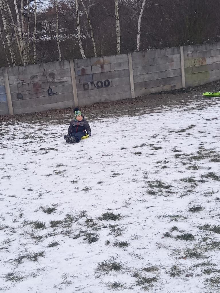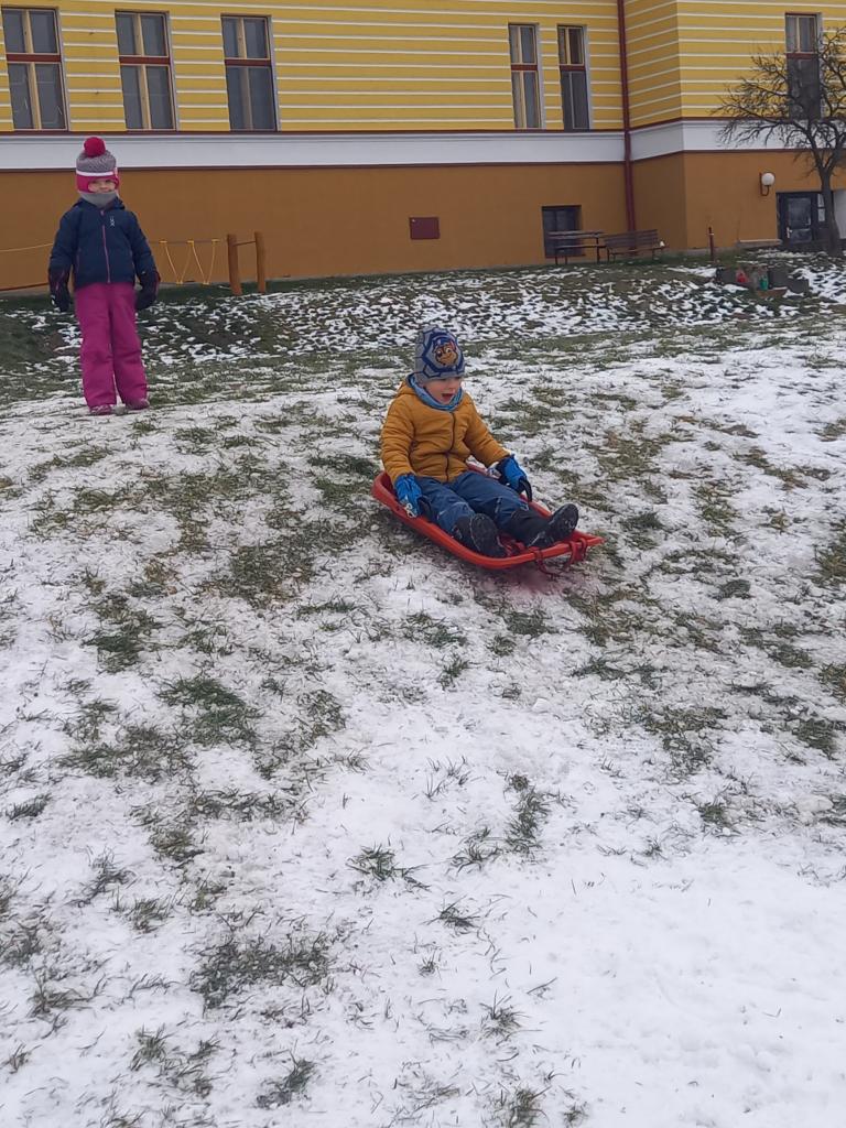 I přesto, že je jen trocha sněhu, bobujeme a hrajeme si na sněhu na zahradě..